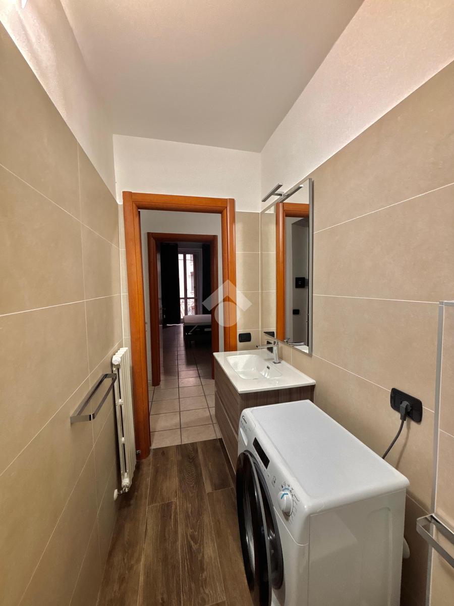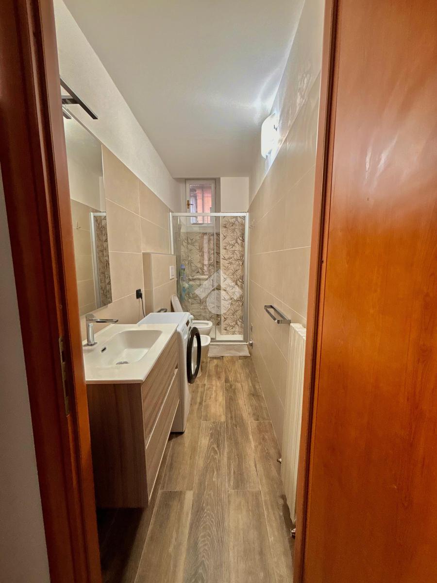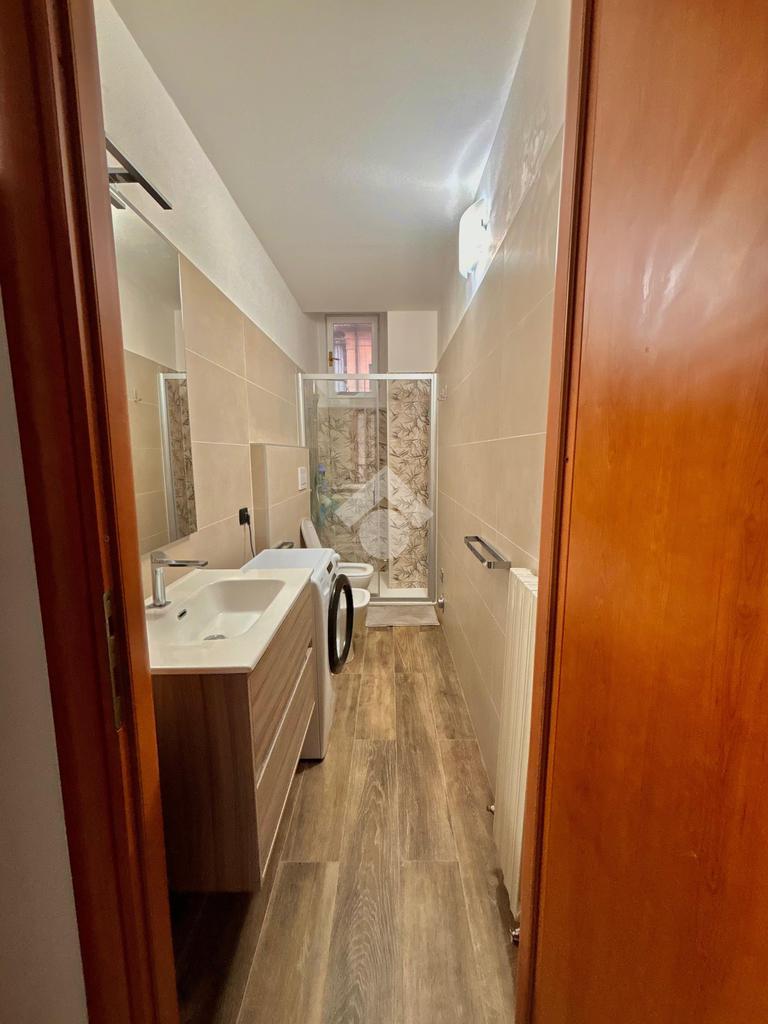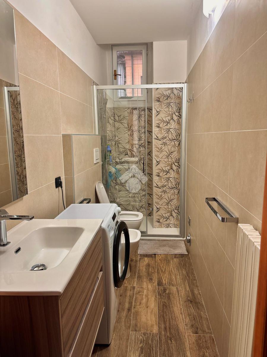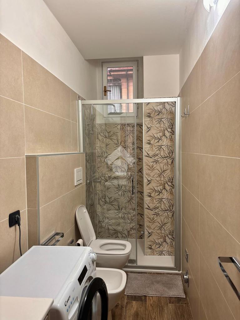 Il bagno, anch’esso rinnovato, è dotato di box doccia e finiture moderne. Gli infissi doppi in PVC assicurano un ottimo isolamento acustico e termico.